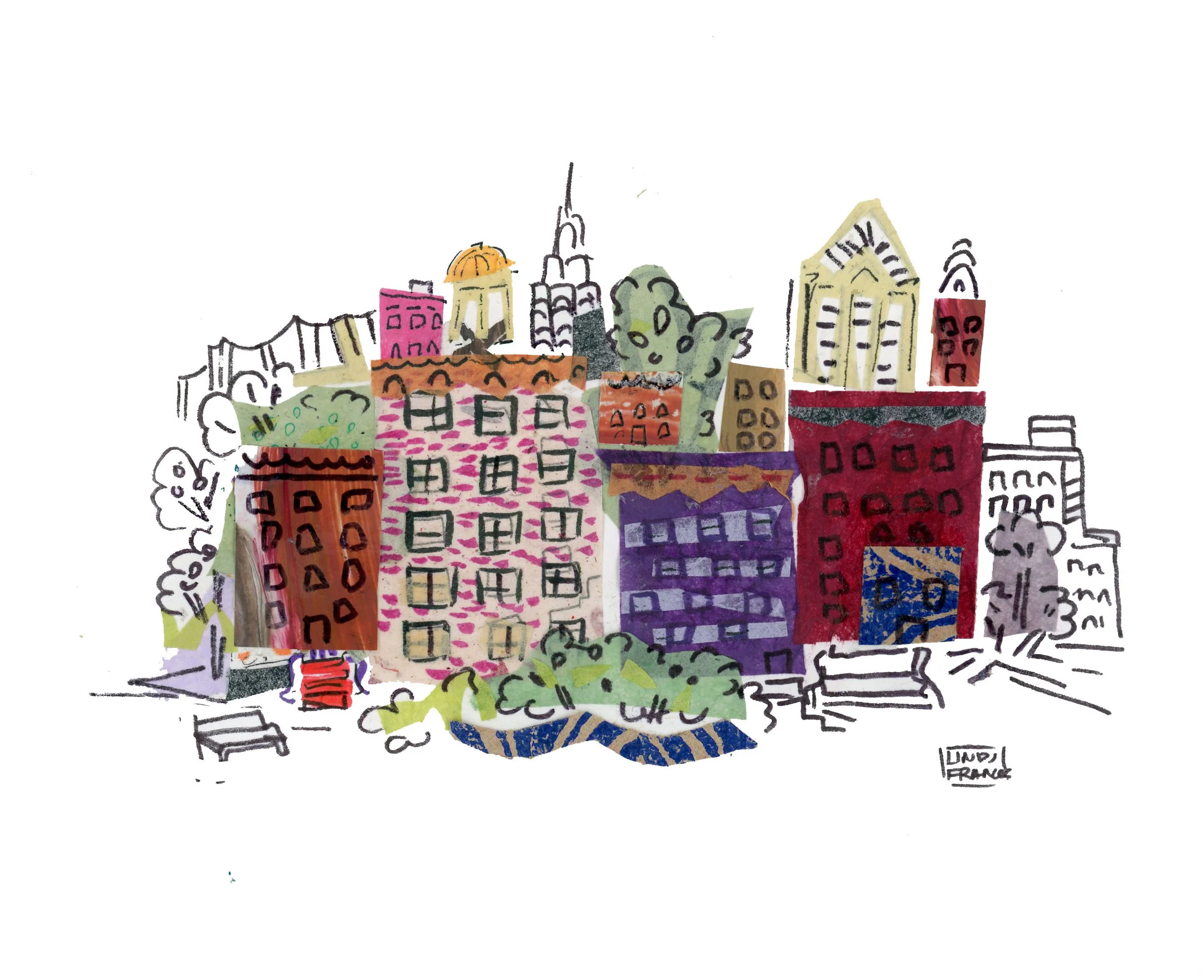 These whimsical, colorful works span the illustration and painterly styles I’ve explored over the past decade. My subjects range from New York City scenes to a retro-inspired world of people, objects, and moments. I’m drawn to a mixed-media approach, letting abstract color and shape brush up against traditional figuration.